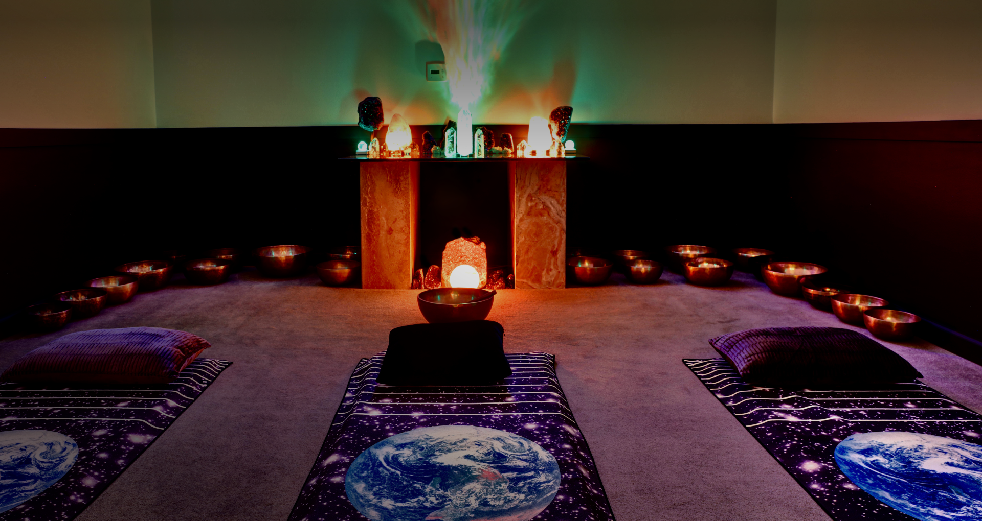 Generally, each session lasts around 60 minutes. The client will be laying down, face-up, on a high-quality, comfortable massage table or on soft layered mats. Pillows are provided. Sitting in a chair is also an option if you would prefer over laying down. The sound meditation studio is strategically laid out in the form of a crystal grid driven by clear quartz crystals. The lighting is soft and dimly lit to bring a comforting feeling to welcome you.